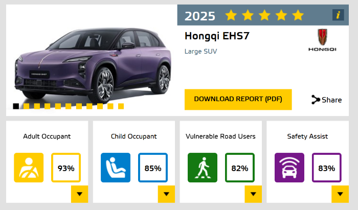 ▲紅旗EHS7海外車型斬獲E-NCAP五星認(rèn)證