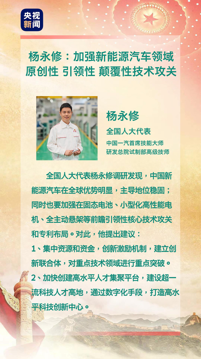 今年全國兩會,楊永修代表準備就加強新能源汽車領域原創(chuàng)性、引領性、顛覆性技術攻關等方面提出建議: