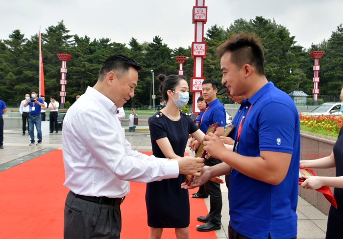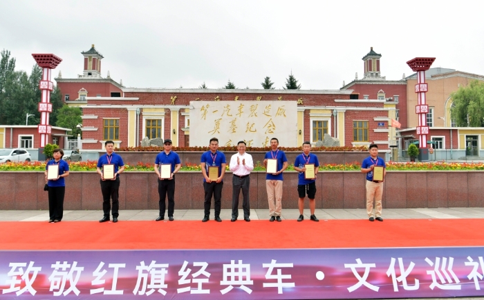 在一號門廣場前,集團公司董事長、黨委書記徐留平為七位紅旗經(jīng)典車車主頒發(fā)“紅旗文化大使”榮譽稱號證書,并合影留念。集團公司黨委常委、副總經(jīng)理雷平主持儀式。