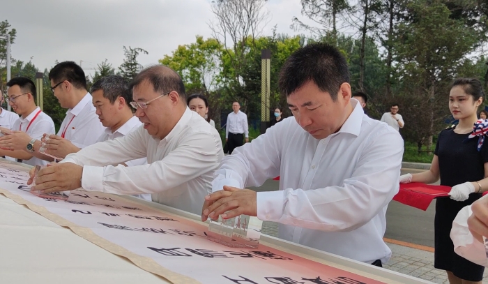 劉亦功與紅旗經典車車主共同在《新紅旗賦》長卷上蓋印留念