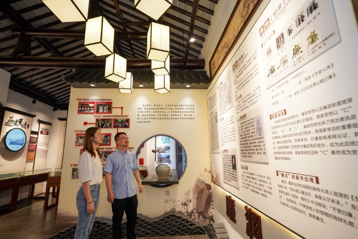 參觀者在蘇州市吳江區(qū)平望鎮(zhèn)廉潔教育基地鶯湖廉園內(nèi)參觀(2024年7月4日攝)。新華社記者 李博 攝
