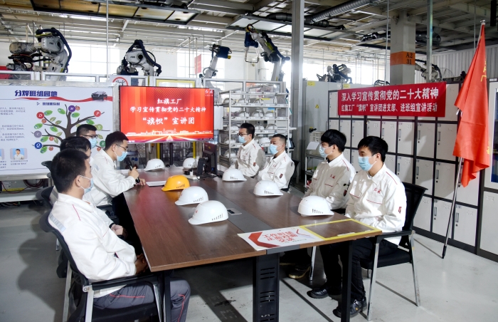 宣講團的首場宣講走進焊裝車間分焊班。宣講團成員圍繞黨的二十大報告主題、過去5年的工作和新時代10年的偉大變革、新時代新征程中國共產(chǎn)黨的使命任務(wù)、中國式現(xiàn)代化的中國特色和本質(zhì)要求等內(nèi)容進行宣講,同時結(jié)合個人學(xué)習(xí)體會和工作實際與廣大員工開展分享和交流。