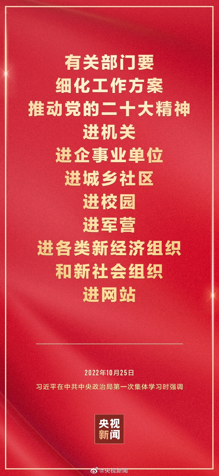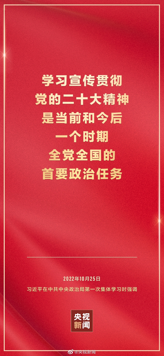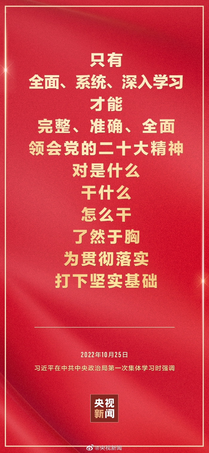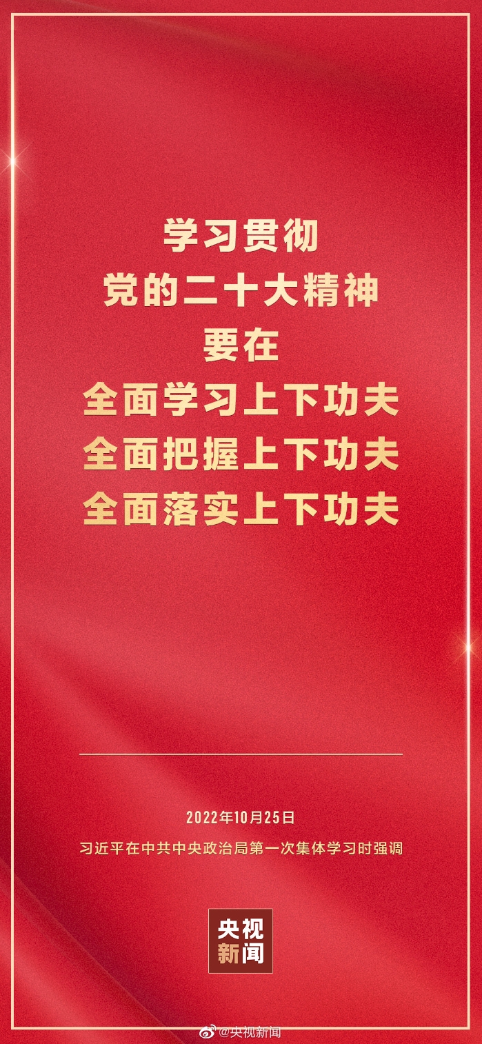 二十屆中共中央政治局10月25日下午就學習貫徹黨的二十大精神進行第一次集體學習。中共中央總書記習近平在主持學習時強調,全黨要在全面學習、全面把握、全面落實上下功夫,堅定不移把黨的二十大提出的目標任務落到實處,奮力奪取全面建設社會主義現代化國家新勝利。
