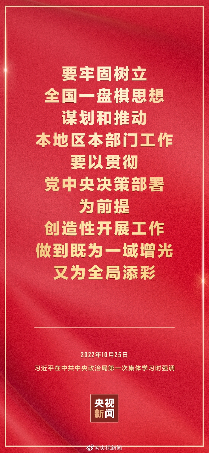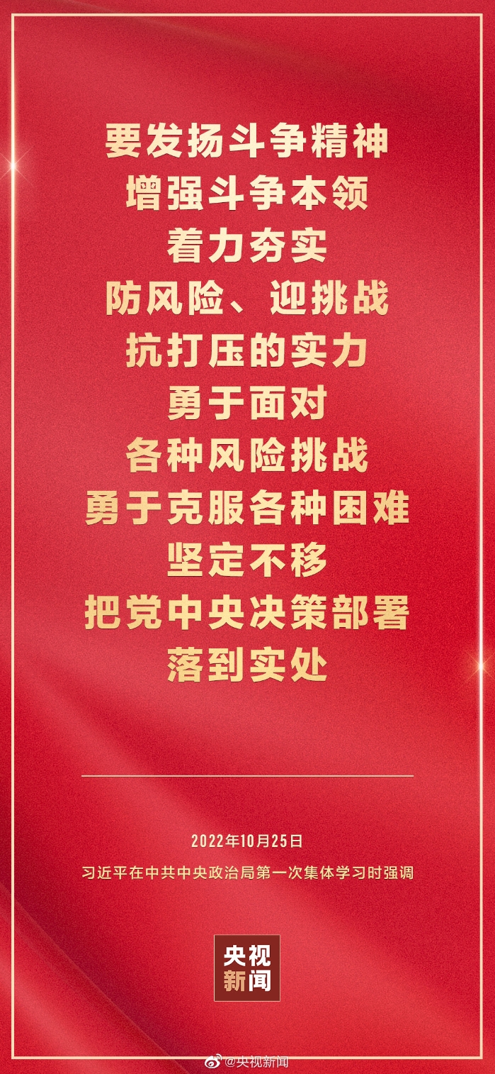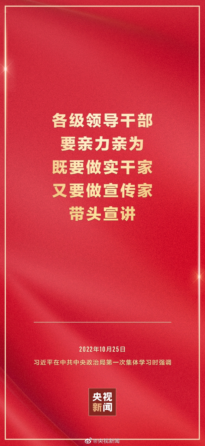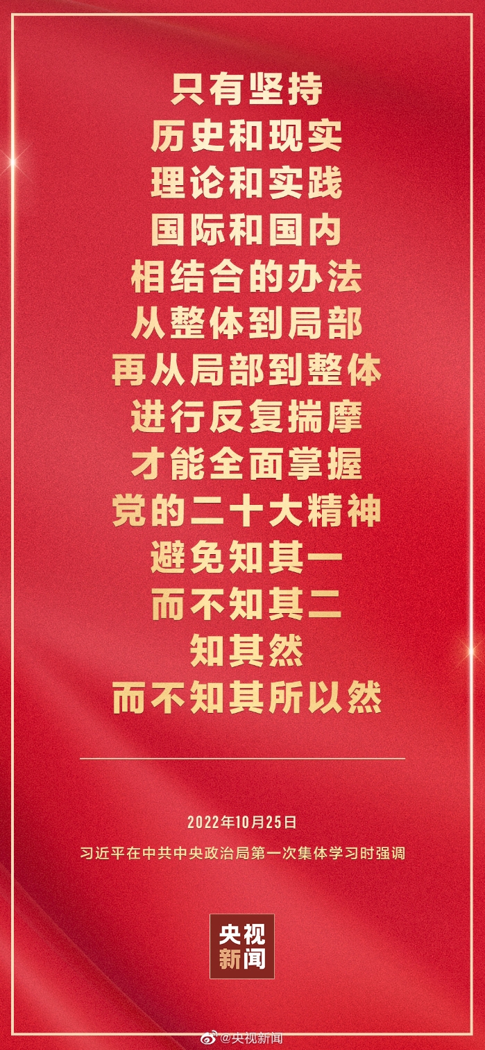 二十屆中共中央政治局10月25日下午就學習貫徹黨的二十大精神進行第一次集體學習。中共中央總書記習近平在主持學習時強調,全黨要在全面學習、全面把握、全面落實上下功夫,堅定不移把黨的二十大提出的目標任務落到實處,奮力奪取全面建設社會主義現代化國家新勝利。